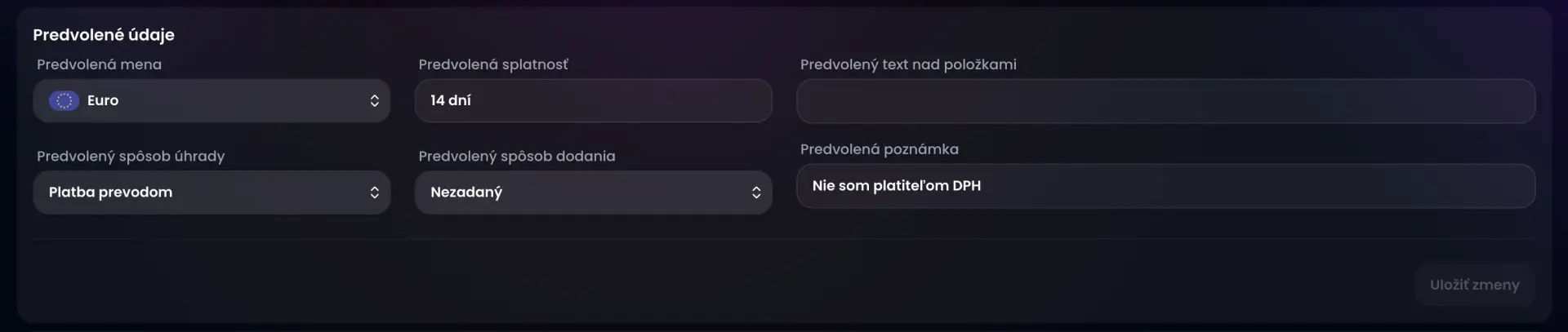 Keď budú niektoré nastavené ako predvolené, všetky nové faktúry a doklady sa pri tvorbe načítajú s týmito hodnotami.