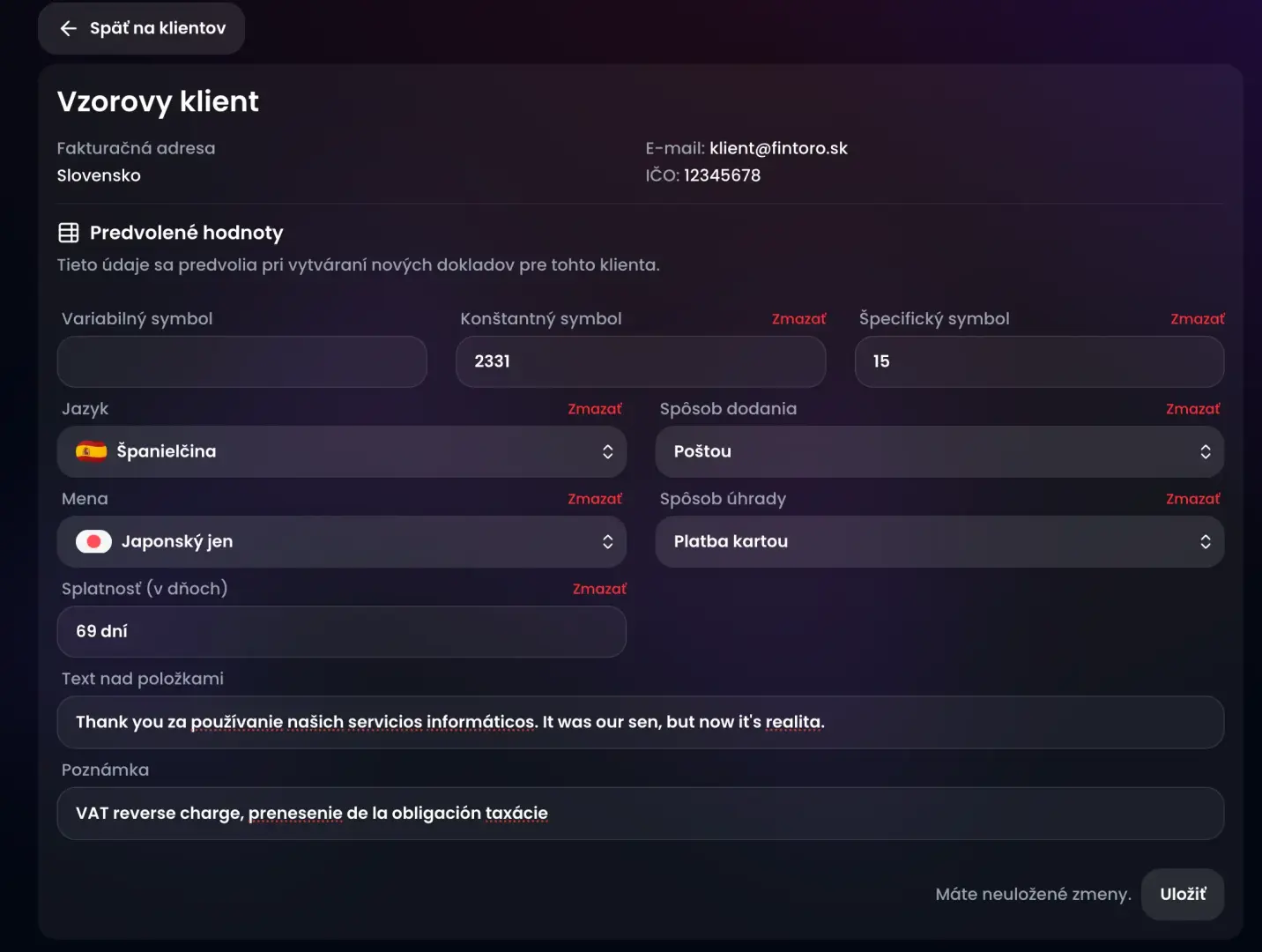 Často sa potreby podnikateľov líšia - aj preto máte možnosť nastaviť si svoje predvolené hodnoty a údaje pre konkrétneho klienta. Platí to pre faktúry, ale aj ostatné doklady.