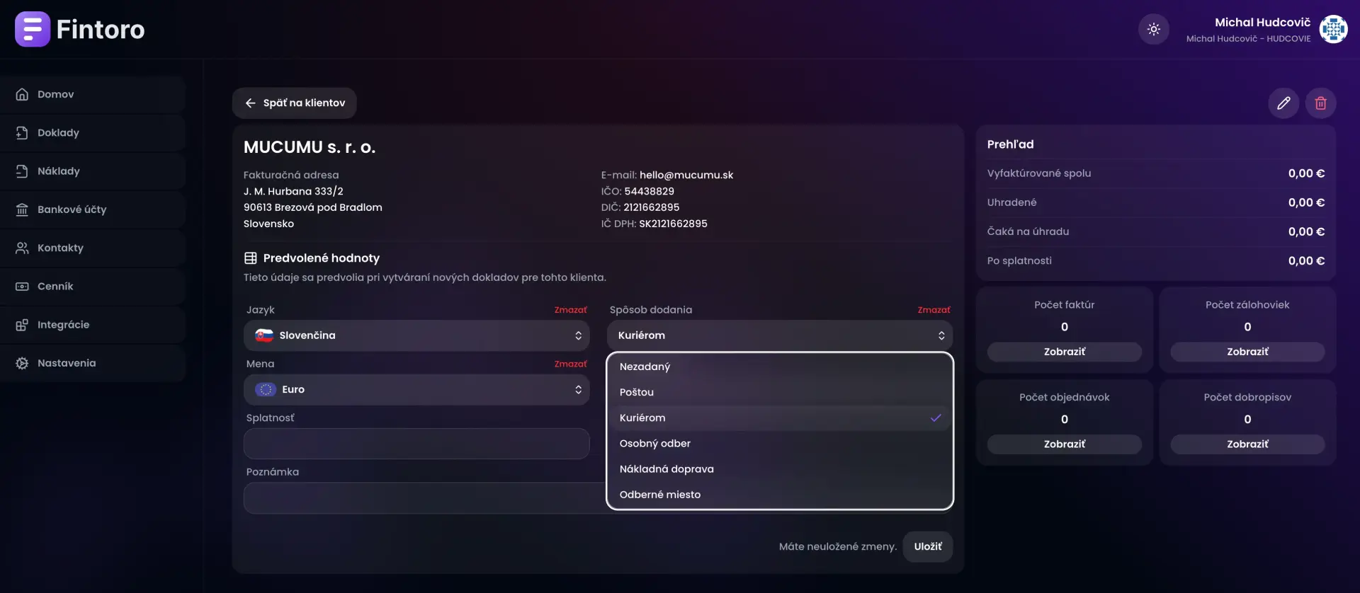 Ak potrebujete vo Fintoro nastaviť predvolený spôsob dodania (spôsob dopravy) faktúry pre konkrétneho klienta (napr. kuriérom, poštou, osobný odber, elektronicky alebo iné), môžete to urobiť veľmi jednoducho. Keď si pridáte do kontaktov klienta resp. odberateľa, môžete si pre neho a jeho údaje nastaviť predvolené hodnoty. Alebo si môžete upraviť spôsob dodania pri tvorbe každej konkrétnej faktúry alebo dokladu. Prejdite na tento návod pre nastavenie predvoleného spôsobu dodania fakturácie pre všetky faktúry a doklady (nie len pre konkrétnych klientov).