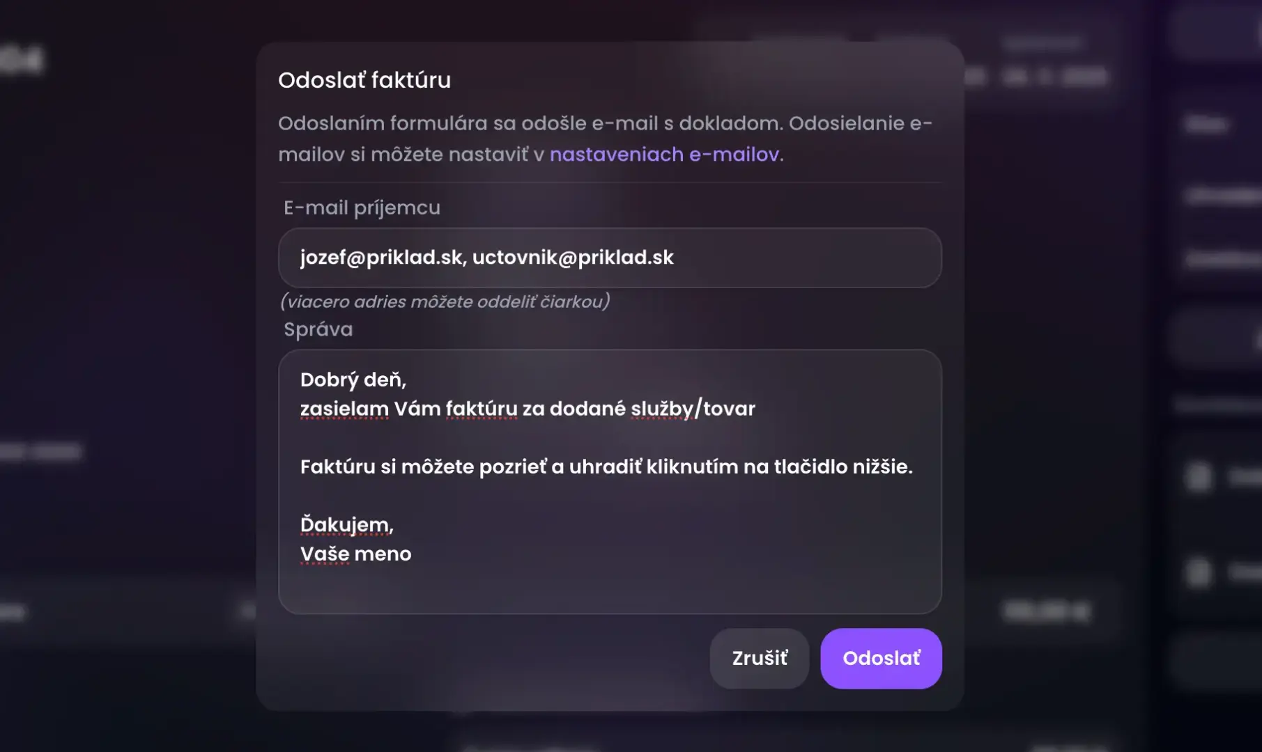 Keď kliknete na "Odoslať faktúru", môžete upraviť správu, pridať ďalších príjemcov, napríklad aj účtovníka alebo váš ďalší firemný e-mail pre faktúry. Viacero e-mailových adries a príjemcov oddeľte čiarkou. Napr.