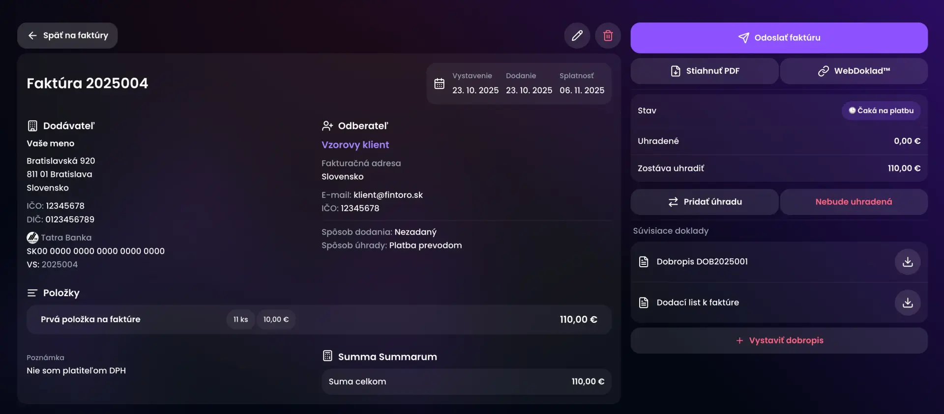 No nie len to! Faktúry a ďalšie doklady môžete poslať e-mailom svojim klientom alebo účtovníkovi priamo z Fintoro.