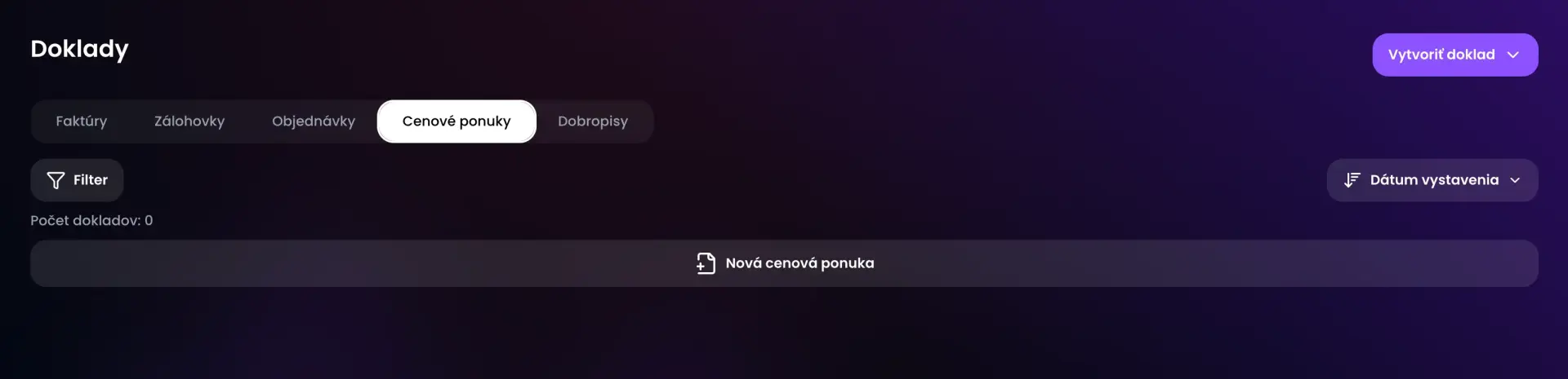 K vytvoreniu novej cenovej ponuky sa môžeme dostať cez hlavné menu v sekcii "Doklady".