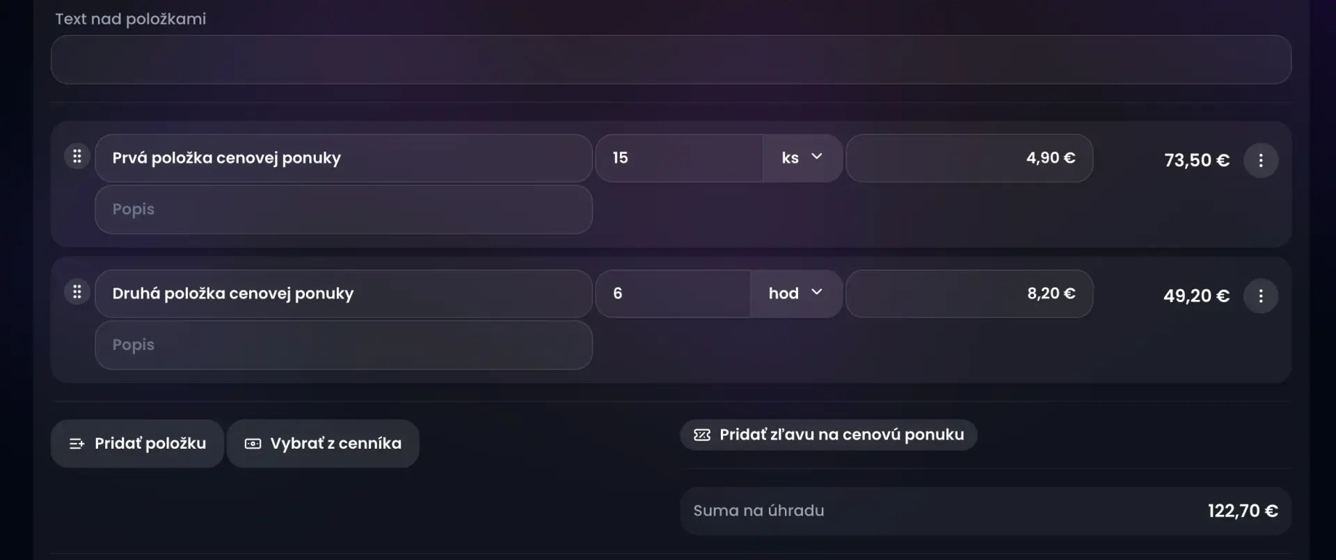 Zadáme cenu položky. Môžeme pridať aj popis alebo zľavu na konkrétnu položku.
