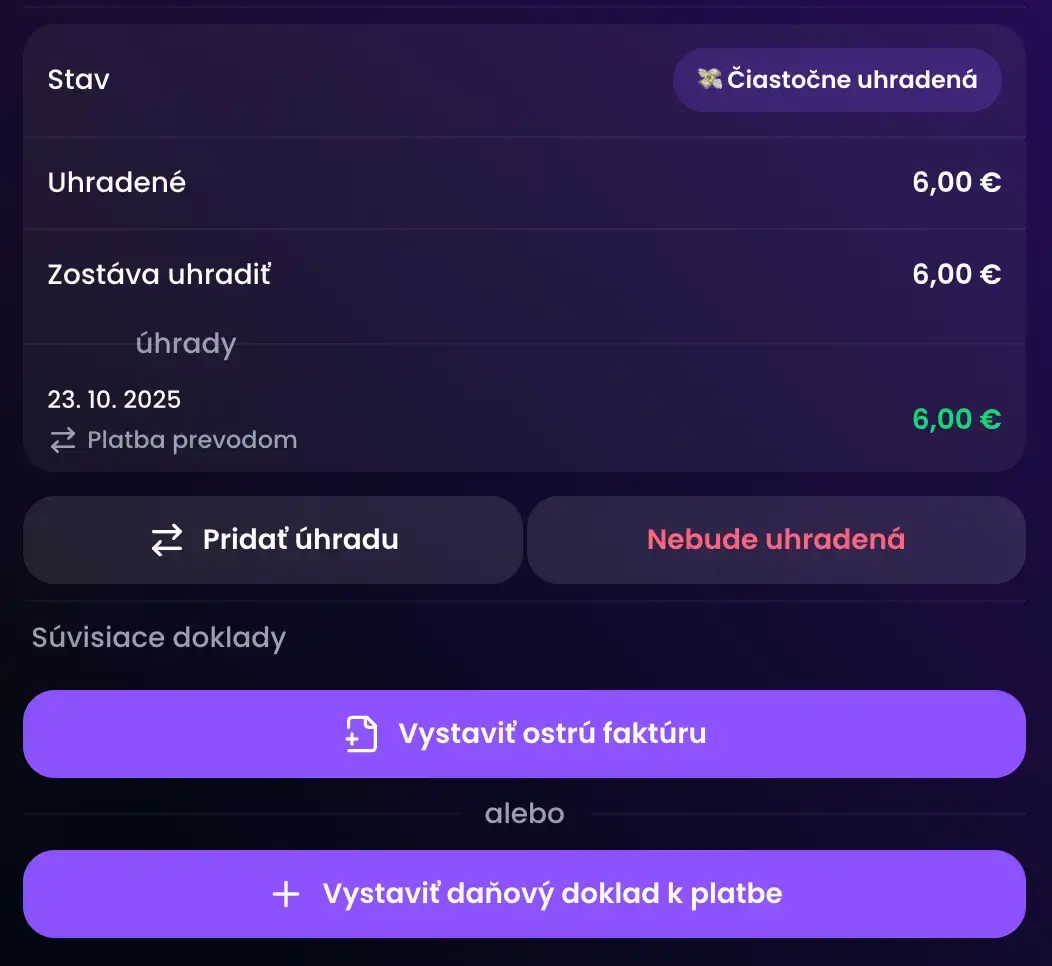 - Po pridaní úhrady, celkovej alebo čiastočnej, budete mať možnosť k zálohovej faktúre vystaviť ostrú faktúru alebo daňový doklad k platbe.