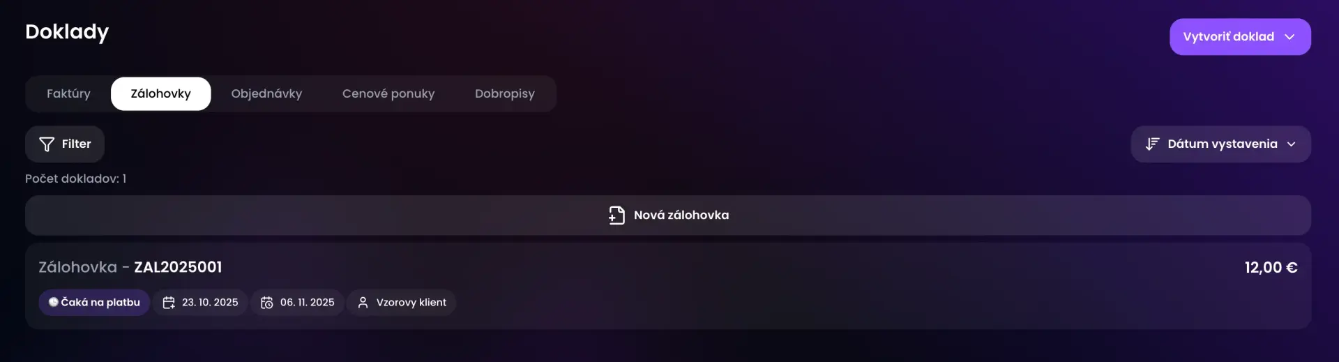 Po vytvorení daňového dokladu k platbe sa vytvorí samostatný doklad. Môžete si ho ihneď stiahnuť. Zároveň sa automaticky pridá do zoznamu Faktúr medzi dokladmi. Aj tu si môžete doklad samostatne otvoriť, stiahnuť do PDF alebo poslať e-mailom priamo klientovi.
