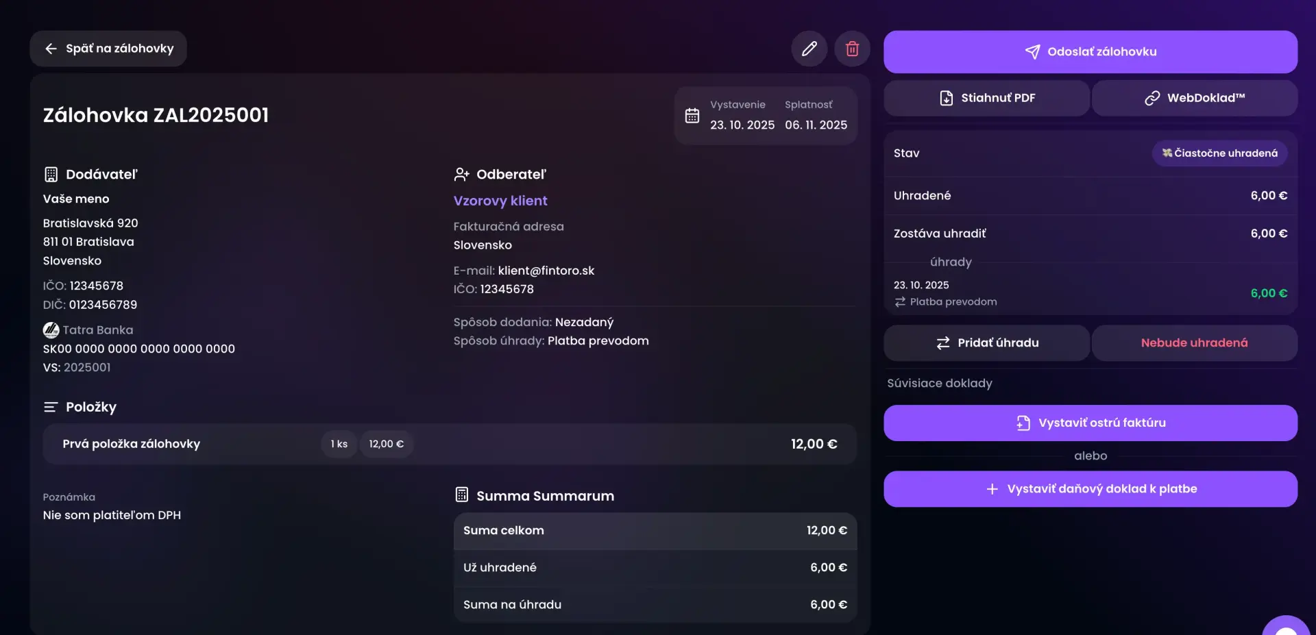 Poznámka: daňový doklad k platbe je možné cez Fintoro vytvoriť iba k pridanej úhrade na zálohovej faktúre.