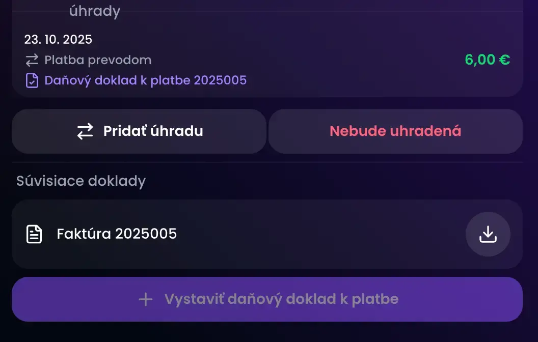 Po pravej strane môžete k zálohovým faktúram pridávať a evidovať úhrady manuálne, alebo po prepojení bankového účtu aj automaticky. Keď si pridáte úhradu, celkovú alebo čiatočnú, umožní sa vám tvorba daňového dokladu k platbe.