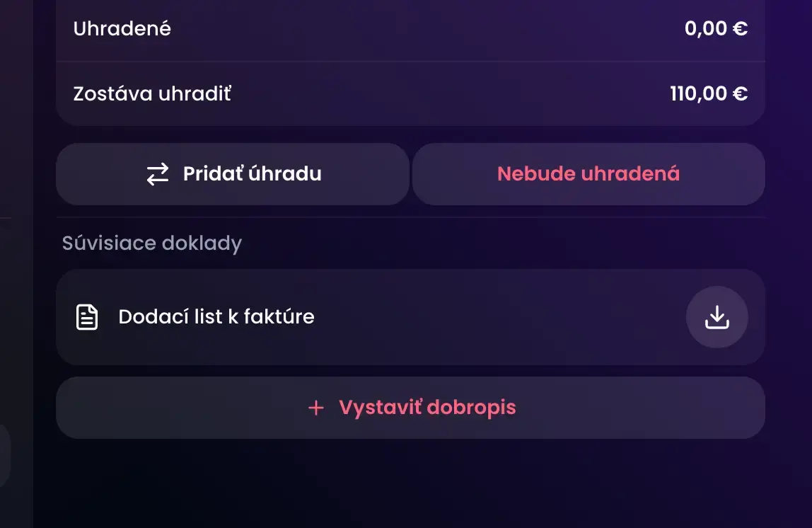 Keď ste si rozklikli a otvorili konkrétnu faktúru, po pravej strane máte jej dodatočné funkcie, nastavenia a tlačidlá pre stiahnutie či odoslanie e-mailom. Pod nimi sa nachádza položka Dodací list k faktúre.