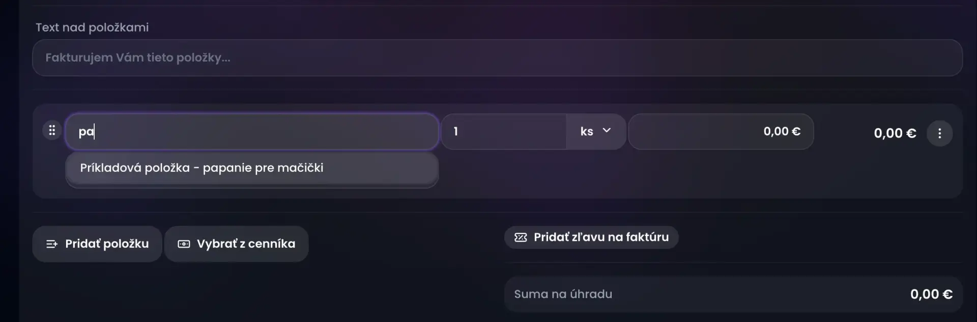 - Ak máte pridané do cenníka - jedným kliknutím vyberiete položku