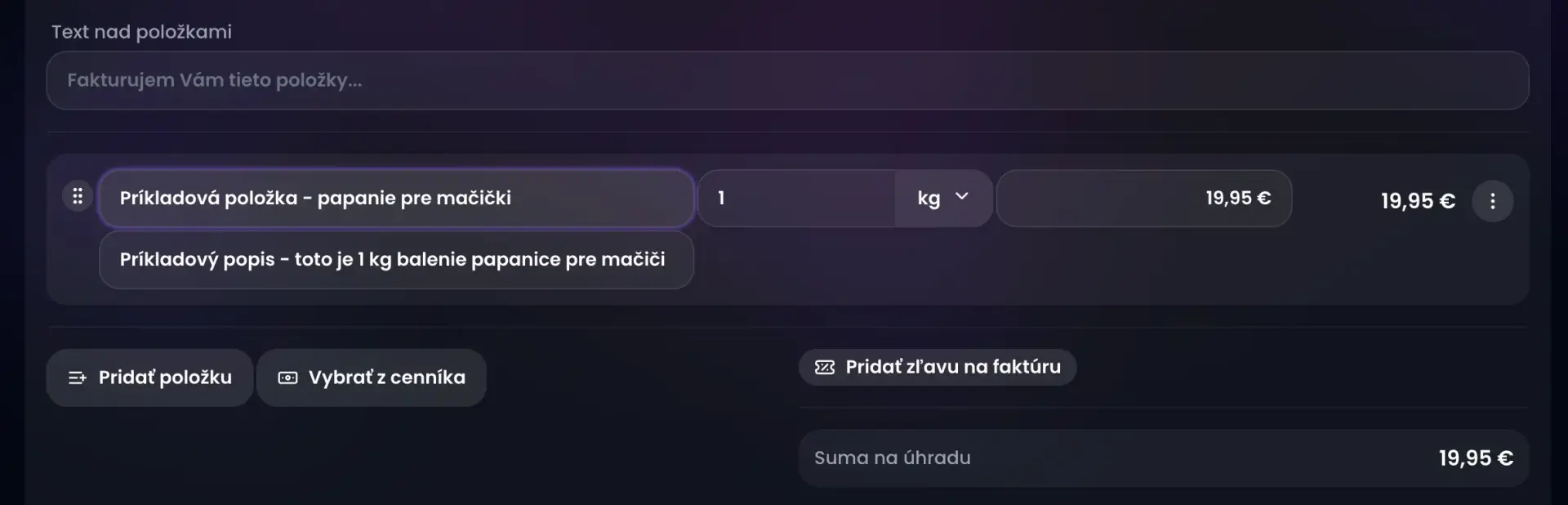 Je to zoznam vašich tovarov alebo služieb. Môžete im špecifikovať jednotkovú cenu a aj jednotku, napr. hodiny alebo počet kusov.